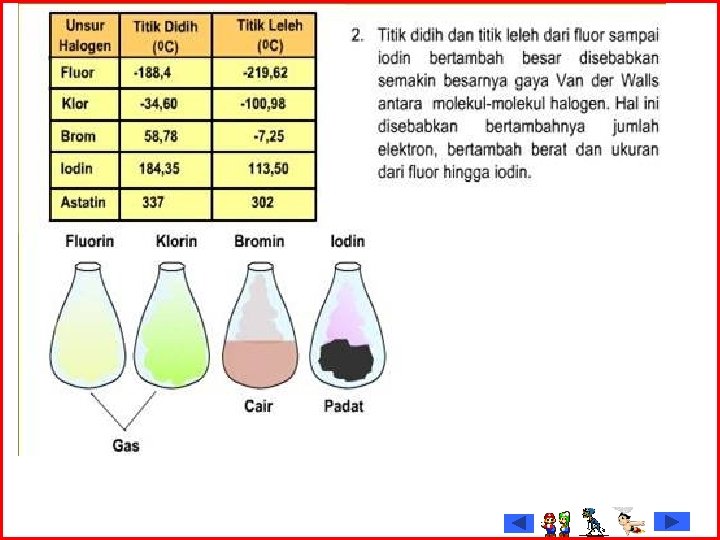 Sifat-sifat halogen Titik didih dan titik leleh a. Jari-jari atom unsur halogen bertambah dari flourin sampai astatin b. Panjang ikatan dalam molekul halogen (diatomik) meningkat c. Titik didh dan titik leleh dari flourin sampai astatin meningkat
