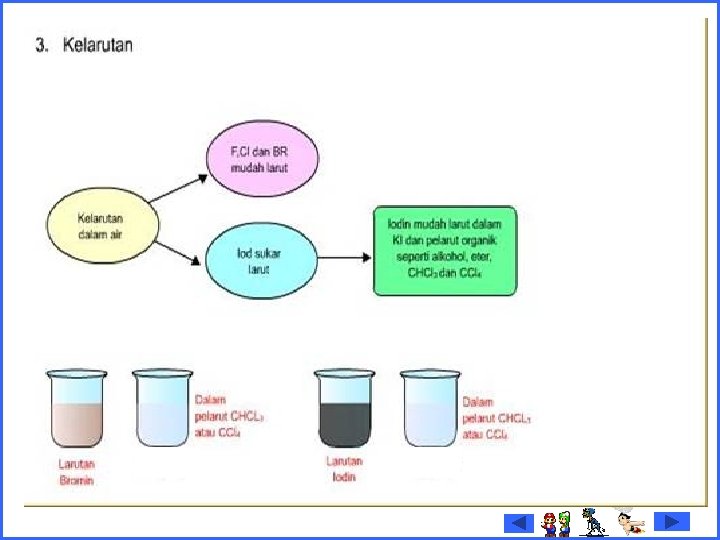 Kelarutan a. Kelarutan flourin, klorin, dan bromin dalam air besar atau mudah larut b. kelarutan Iodin larut dalam air dalam jumlah kecil c. Iodin mudah larut dala larutan KI