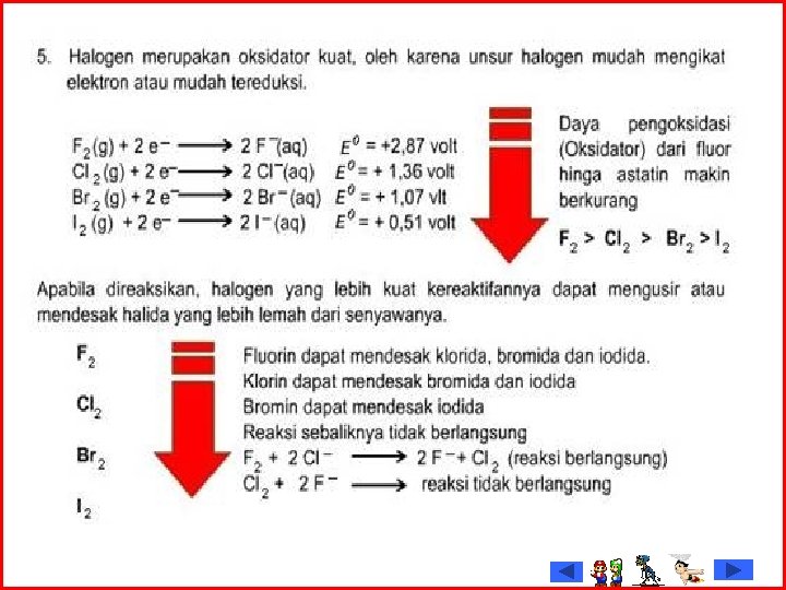 Kereaktifan a. Jari-jari atom unsur halogen bertambah dari flourin sampai astatin b. Gaya tarik inti terhadap penerimaan (afinitas) elektro makin lemah c. Kereaktifan halogen dari flourin sampai astatin berkurang