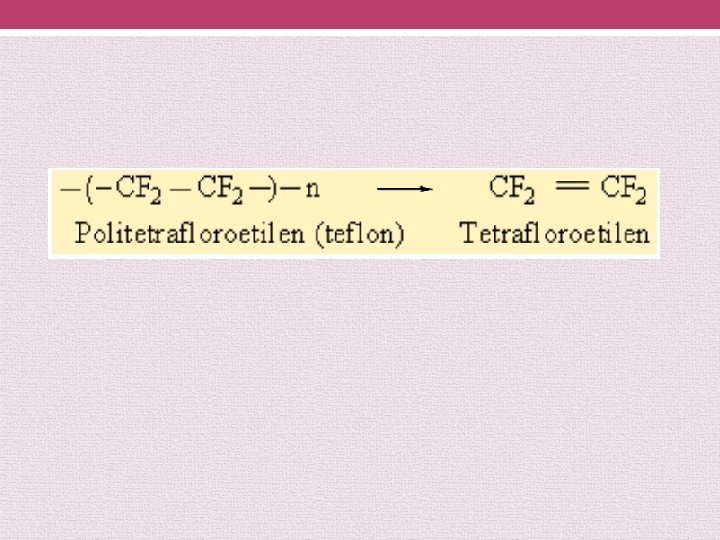 Politetrafloroetilen (Teflon): Etilendeki Hidrojen atomlarının tamamının, Flor atomlarıyla yer değiştirmesi sonucu tetrafloroetilen oluşur. Tetrafloraetilen polimerleşerek politetrafloroetileni meydana getirir, diğer ismi teflondur. Teflonun yapışmama özelliği vardır. Bu özelliğinden yararlanarak tava ve tencereler yapılır. Mekanik dayanımının zayıf olması dezavantajıdır. Değerli bir polimerdir. Politetrafloroetilen (Teflon) kullanılarak yapılmış olan tava ve teflon bant
