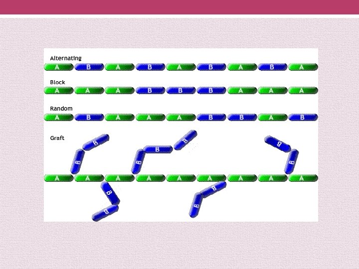 Kopolimer Zincirlerinde kimyasal yapısı farklı birden fazla monomer birimi bulunan polimerdir. Eğer polimer molekülü iki farklı monomerin birleşmesinden oluşuyorsa buna “kopolimer” denir. — AB— —A— B—A—B— CH 3 | — CH 2 —| CH 2— CH 2 — Etilen Propilen Kopolimerlerin özelliğini, yapısını oluşturan monomerlerin oranı belirler. Ayrıca kopolimer üzerindeki monomerin diziliş şekli önemlidir. Kopolimerleri gelişigüzel, ardışık, blok ve aşı polimerleri olarak dört gruba ayırabiliriz