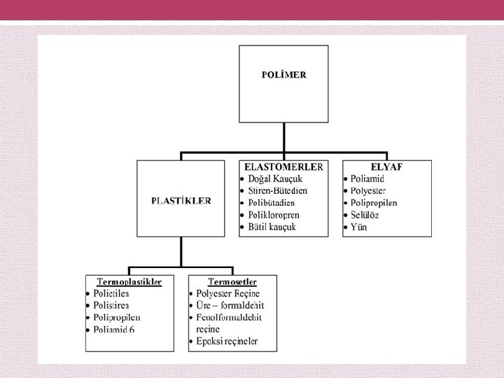 Polimerlerin sınıflandırılması Polimerlerin Kimyasal Yapılarına Göre Sınıflandırılması Polimerin ana zincirini oluşturan atomların türü açısından polimerler organik ve inorganik olarak sınıflandırılır.