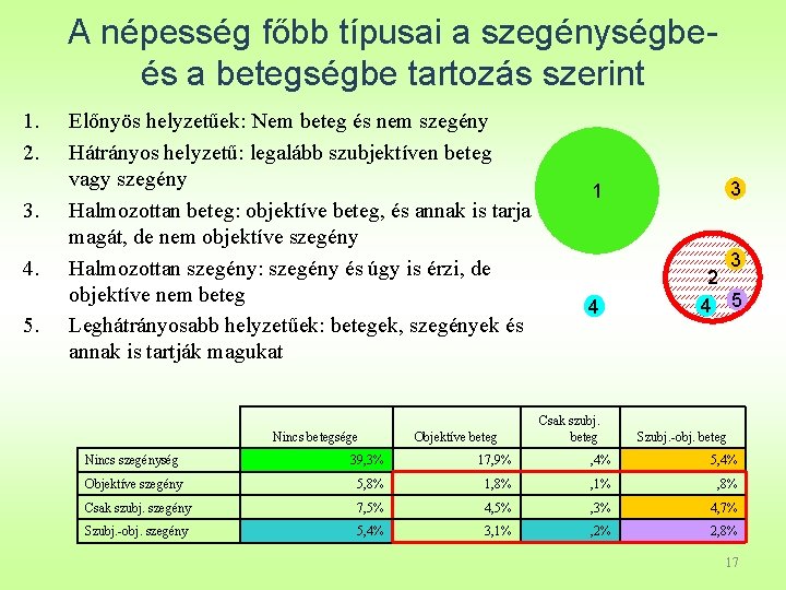 A népesség főbb típusai a szegénységbe- és a betegségbe tartozás szerint 1. 2. 3. 4. 5. Előnyös helyzetűek: Nem beteg és nem szegény Hátrányos helyzetű: legalább szubjektíven beteg vagy szegény Halmozottan beteg: objektíve beteg, és annak is tarja magát, de nem objektíve szegény Halmozottan szegény: szegény és úgy is érzi, de objektíve nem beteg Leghátrányosabb helyzetűek: betegek, szegények és annak is tartják magukat Nincs betegsége Objektíve beteg 3 1 3 4 Csak szubj. beteg 2 4 5 Szubj. -obj. beteg Nincs szegénység 39, 3% 17, 9% , 4% 5, 4% Objektíve szegény 5, 8% 1, 8% , 1% , 8% Csak szubj. szegény 7, 5% 4, 5% , 3% 4, 7% Szubj. -obj. szegény 5, 4% 3, 1% , 2% 2, 8% 17