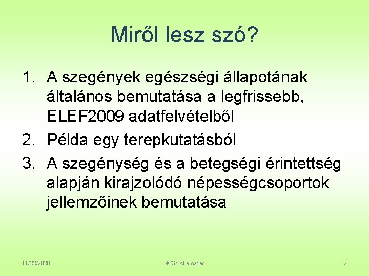 Miről lesz szó? 1. A szegények egészségi állapotának általános bemutatása a legfrissebb, ELEF 2009 adatfelvételből 2. Példa egy terepkutatásból 3. A szegénység és a betegségi érintettség alapján kirajzolódó népességcsoportok jellemzőinek bemutatása 11/22/2020 NCSSZI előadás 2