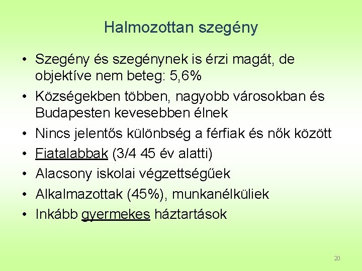 Halmozottan beteg • A lakosság 10%-a, beteg, de jövedelmi viszonyai szerint nem szegény • Települési jellemző nincs • Közel 2/3 nő • Jellemzően idősek, 60% 65 évnél idősebb • Alacsony végzettségűek, de negyedük érettségizett (idősek!) • Nyugdíjas, járadékos 84%-uk • Kevesebb gyermek él ilyen háztartásokban 19