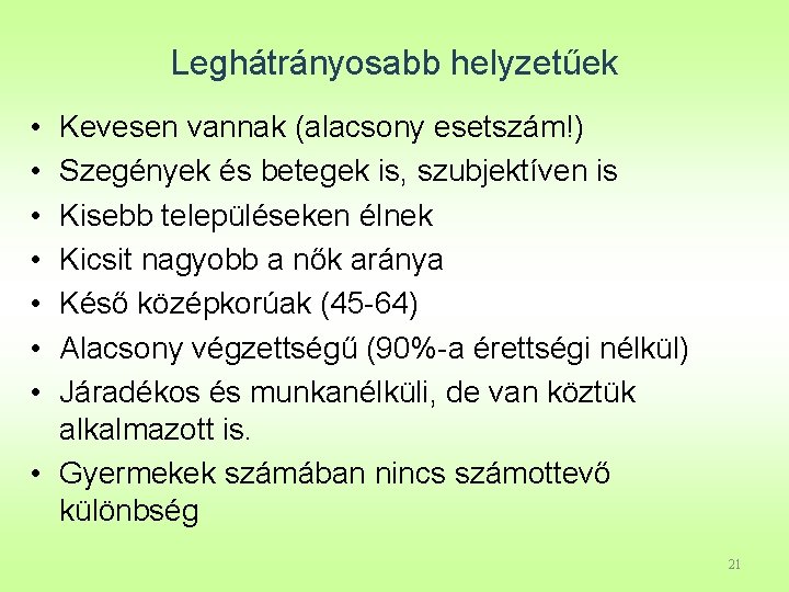 Halmozottan szegény • Szegény és szegénynek is érzi magát, de objektíve nem beteg: 5, 6% • Községekben többen, nagyobb városokban és Budapesten kevesebben élnek • Nincs jelentős különbség a férfiak és nők között • Fiatalabbak (3/4 45 év alatti) • Alacsony iskolai végzettségűek • Alkalmazottak (45%), munkanélküliek • Inkább gyermekes háztartások 20