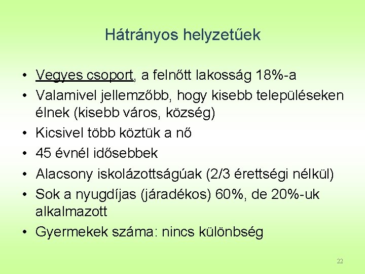 Leghátrányosabb helyzetűek • • Kevesen vannak (alacsony esetszám!) Szegények és betegek is, szubjektíven is Kisebb településeken élnek Kicsit nagyobb a nők aránya Késő középkorúak (45 -64) Alacsony végzettségű (90%-a érettségi nélkül) Járadékos és munkanélküli, de van köztük alkalmazott is. • Gyermekek számában nincs számottevő különbség 21