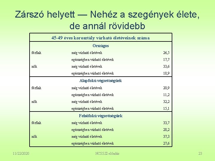Zárszó helyett — Nehéz a szegények élete, de annál rövidebb 45 -49 éves korosztály várható életéveinek száma Országos férfiak még várható életévek 26, 5 egészségben várható életévek 17, 7 nők még várható életévek 33, 6 egészségben várható életévek 18, 9 Alapfokú végzettségűek férfiak még várható életévek 20, 9 egészségben várható életévek 11, 2 nők még várható életévek 32, 2 egészségben várható életévek 15, 1 Felsőfokú végzettségűek 11/22/2020 férfiak még várható életévek 33, 7 egészségben várható életévek 28, 2 nők még várható életévek 37, 3 egészségben várható életévek 27, 6 NCSSZI előadás 23