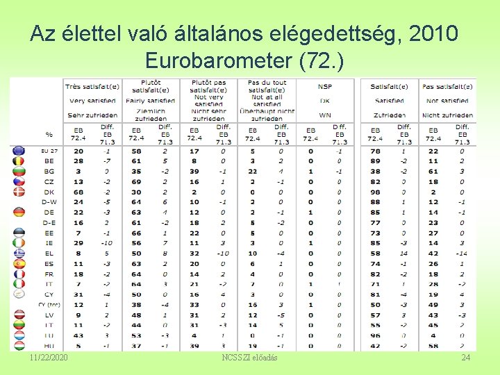Az élettel való általános elégedettség, 2010 Eurobarometer (72. ) 11/22/2020 NCSSZI előadás 24