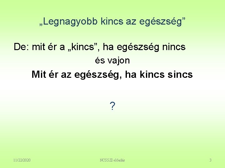 „Legnagyobb kincs az egészség” De: mit ér a „kincs”, ha egészség nincs és vajon Mit ér az egészség, ha kincs sincs ? 11/22/2020 NCSSZI előadás 3