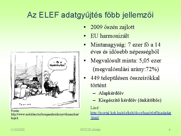 Az ELEF adatgyűjtés főbb jellemzői • 2009 őszén zajlott • EU harmonizált • Mintanagyság: 7 ezer fő a 14 éves és idősebb népességből • Megvalósult minta: 5, 05 ezer (megvalósulási arány: 72%) • 449 településen összeírókkal történt – Alapkérdőív – Kiegészítő kérdőív (önkitöltős) Forrás: http: //www. mobilitas. hu/kompaszkezikonyv/dinamikus/ kepek 11/22/2020 Lásd: http: //portal. ksh. hu/pls/ksh/docs/hun/elef/kiadadat. html NCSSZI előadás 4