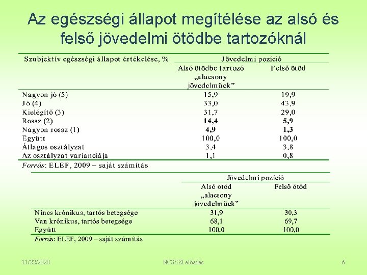 Az egészségi állapot megítélése az alsó és felső jövedelmi ötödbe tartozóknál 11/22/2020 NCSSZI előadás 6