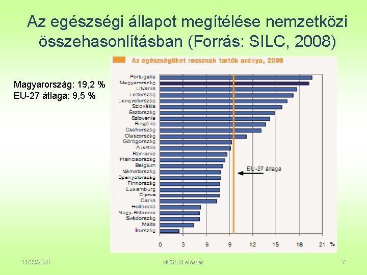 Az egészségi állapot megítélése nemzetközi összehasonlításban (Forrás: SILC, 2008) Magyarország: 19, 2 % EU-27 átlaga: 9, 5 % 11/22/2020 NCSSZI előadás 7