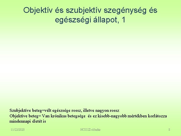 Objektív és szubjektív szegénység és egészségi állapot, 1 Szubjektíve beteg=vélt egészsége rossz, illetve nagyon rossz Objektíve beteg= Van krónikus betegsége és ez kisebb-nagyobb mértékben korlátozza mindennapi életét is 11/22/2020 NCSSZI előadás 8