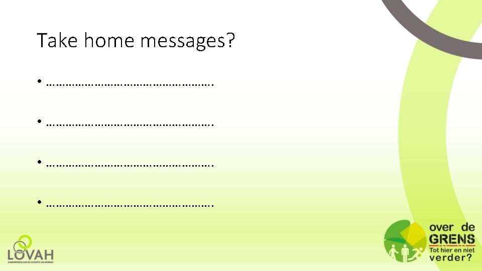 Take home messages • Maak overgewicht bespreekbaar • Hoe eerder, hoe beter • Meeste kans op succes bij multidisciplinaire aanpak • Verantwoordelijkheid bij de ouders leggen en bewegen met het kind • Zoek voor motivatie van de ouders naar “lijden” van het kind in het hier en nu Zorg kent z’n grenzen, maar als huisarts kan je hier veel in betekenen!
