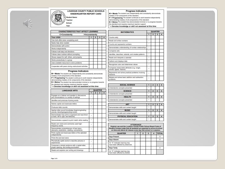 Report Cards �We will be sending home a copy of the report card and parent guide �B- Below P- Progressing M- Meets �A bullet means the learning objective was not assessed/graded during that quarter or at that point in time �Any questions you have regarding the report card will be discussed at conferences �We will have a report card webinar in January