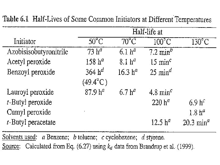 Half life (waktu paruh) didefinisikan sebagai waktu yang diperlukan bagi suatu senyawa untuk bereaksi hingga jumlahnya tinggal setengahnya. Ini dapat diperoleh dengan cara mengintegralkan pers. (20) antara [I]0 pada t = 0 sampai [I] = [I]0/2 pada t = t 1/2 (22) Karena Half life tidak tergantung pada konsentrasi, maka t 1/2 digunakan sebagai kriteris aktivitas inisiator.