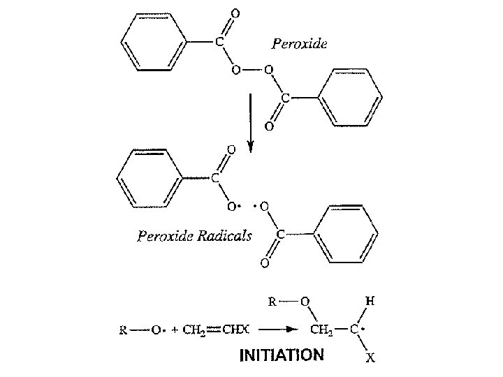 Inisiasi polimerisasi radikal bebas dapat dilakukan dengan beberapa cara: • Pemanasan monomer • Penambahan inisiator yang akan membentuk radikal bebas ketika dipanaskan atau di-radiasi. Contoh inisiator adalah benzoyl peroksida. Ketika dipanaskan, ikatan tunggal O – O yang tak stabil akan terpecah dan dihasilkan dua radikal, masing memiliki satu elektron yang belum berpasangan.