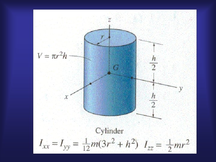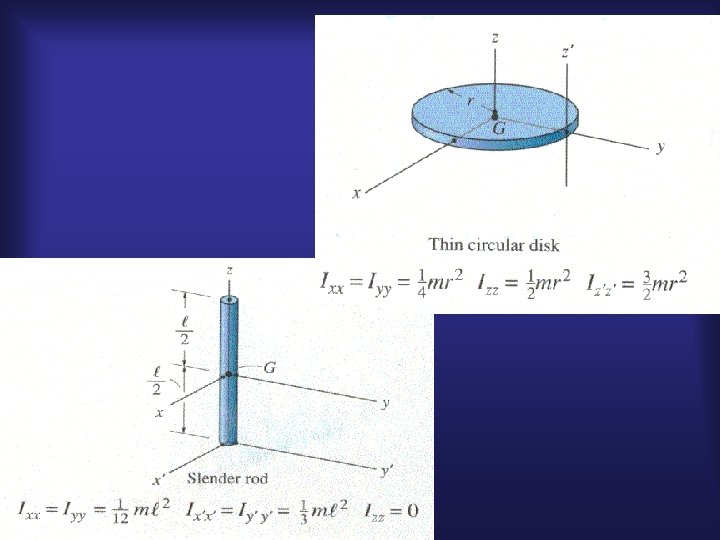 Parallel Axis Theorem • The moment of inertia about any axis parallel to and at distance d away from the axis that passes through the centre of mass is: • Where – IG= moment of inertia for mass centre G – m = mass of the body – d = perpendicular distance between the parallel axes.