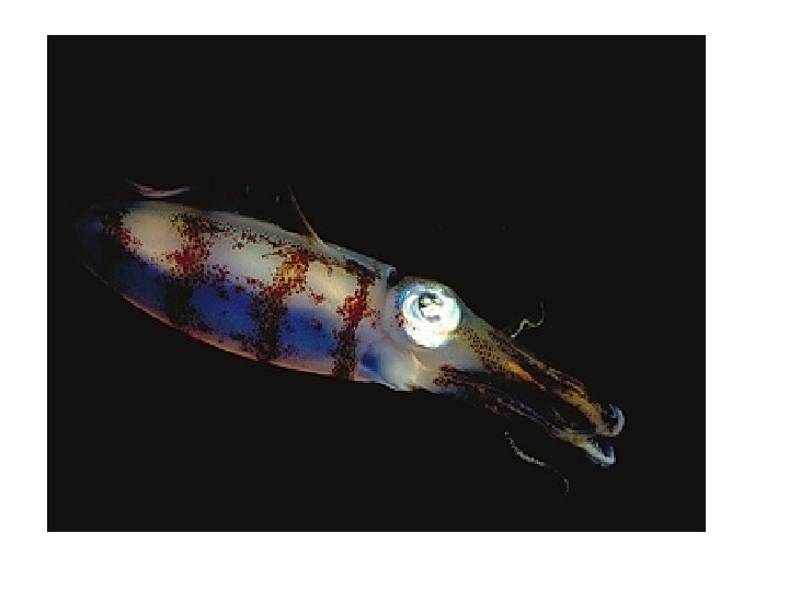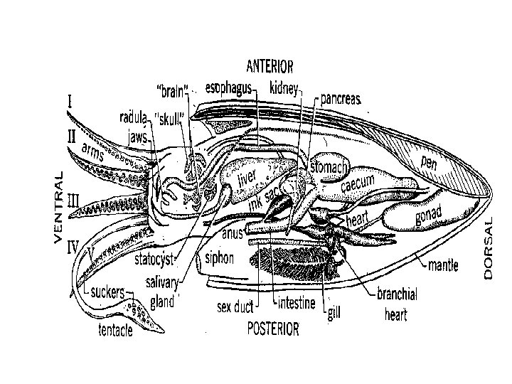Class Cephalopoda “Squid, octopi, chambered nautilus” • Shell external, internal or absent • Foot modified into eight arms and some with two tentacles • mantle muscular and forms a siphon for “jet” propulsion • radula modified as a beak • excellent vision • All marine