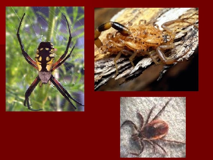 ~Invertebrate Phylum Arthropoda ~ Subphylum Chilicerata n Class n no – Arachnida antennae n 4 pairs of legs n 2 body regions - cephalothorax & abdomen n spiders, scorpions, mites & ticks