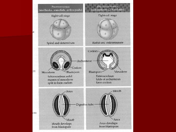 ~ Developmental Characteristics ~ n Animals that develop a mouth from the indented space in the gastrula are protostomes. n Animals that develop an anus from the opening in the gastrula are deuterostomes.