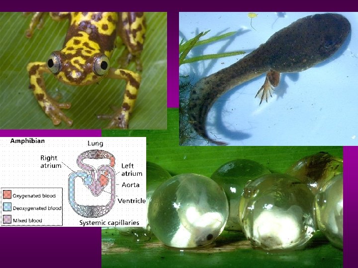 Amphibians • bony skeleton with 4 legsadapted to moving on land • but have permeable skin • Three-chambered heart with two atria and one ventricle • unable to regulate body temperature • have aquatic eggs w/ external fertilization. • metamorphosis (Amphibia refers to "double life", or life in water and on land )