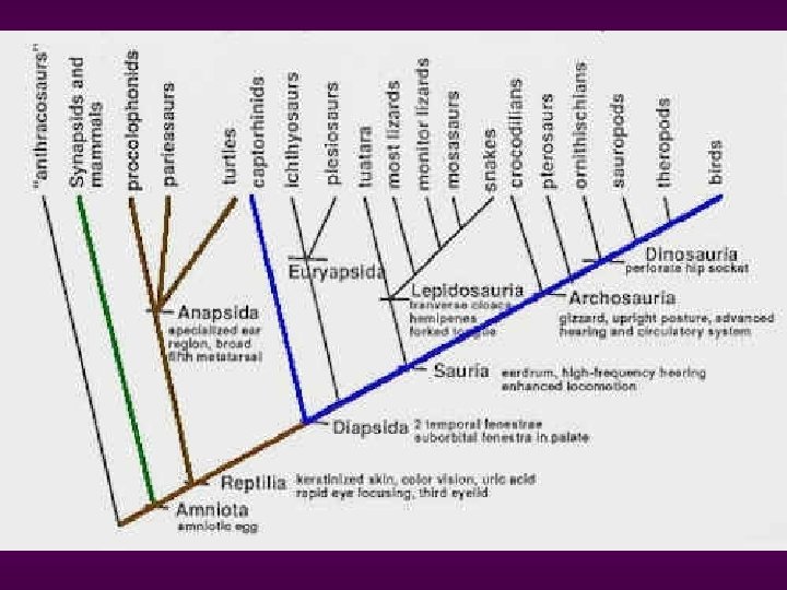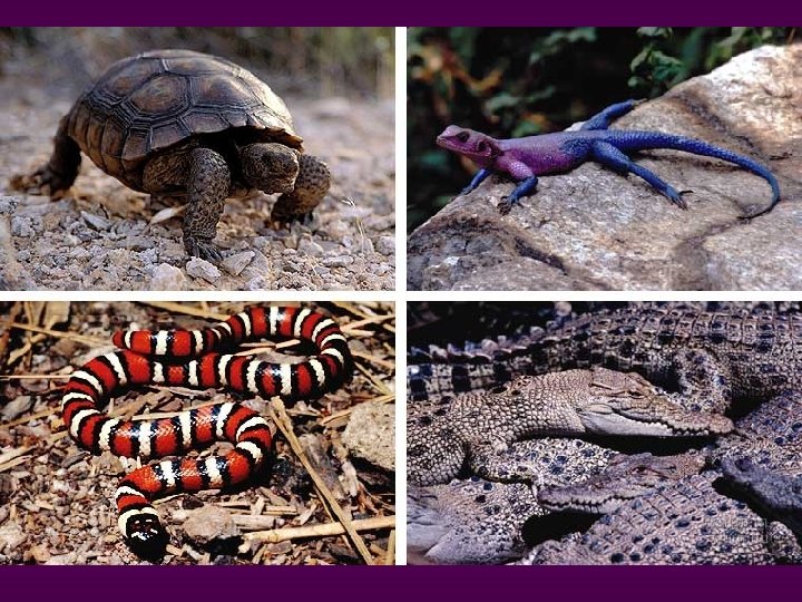 Class Reptilia • better adapted to land: waterproof skin & scales • paired limbs with 5 toes • lungs for respiration, 3 chambered heart (except crocs). • internal fertilization & amniotic eggs. – eggs are covered with a leathery or calcium-based shell (lost in species that give birth to live young)
