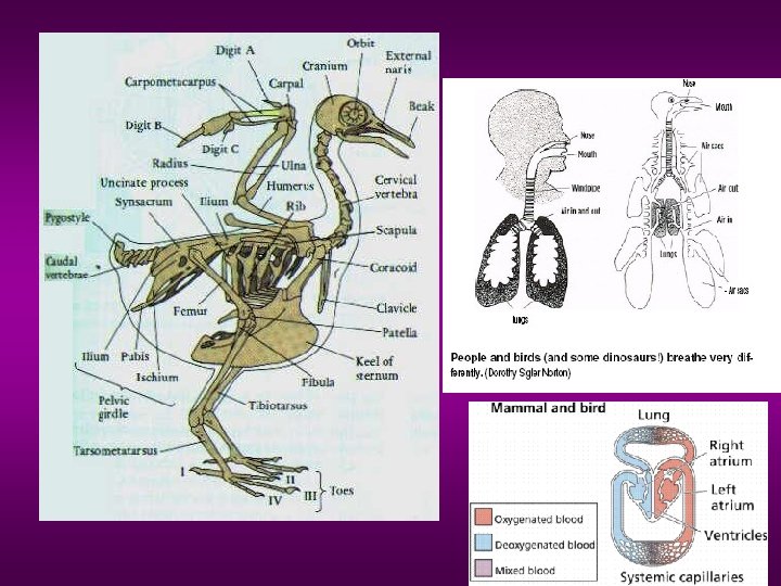 Class Aves • Evolved from reptiles (should be called reptiles!) – 4 chambered heart • Feathers – modified scales (found in fossil dinosaurs) • Tetrapods -forelimbs are modified into wings. • Toothless & hollow bones (flight adaptations). • Crop & Gizzard- for grinding food (crocs have) • Branching air sacs in addition to lungs, helps increase air flow (adaptation to high energy needs)