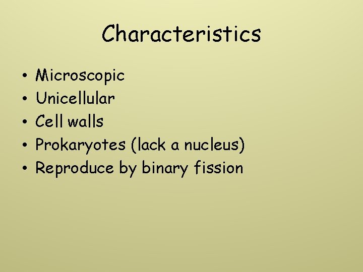 Characteristics • • • Microscopic Unicellular Cell walls Prokaryotes (lack a nucleus) Reproduce by binary fission