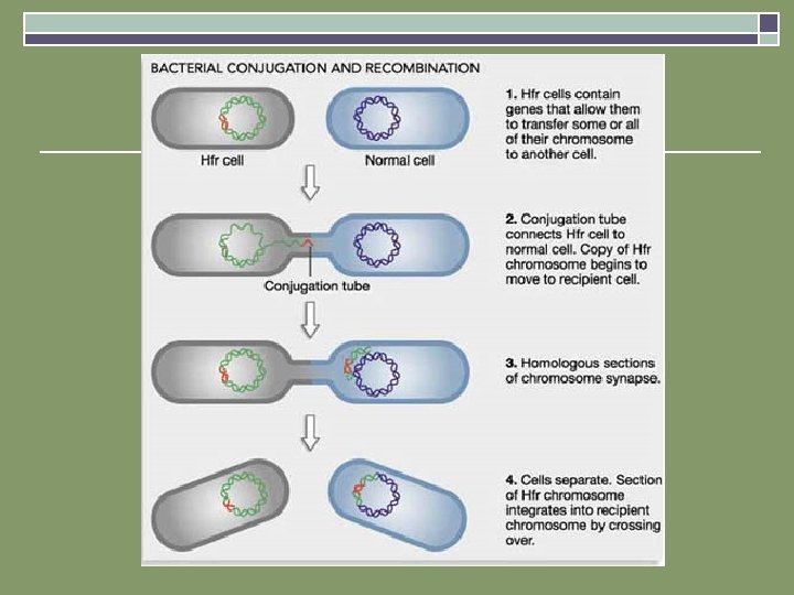 (Steps) Conjugation: 1. 2. 3. 4. 5. Mating pair formation: one of the two bacteria cells extends a pillus to the other cell to form the conjugation tube DNA synthesis: one bacteria makes a copy of its DNA transfer: copied DNA is sent to other cell DNA recombination: in one cell the DNA from the other bacteria integrates with its own Cells separate