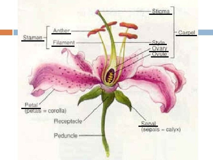 Parts of the Pistil/Carpel Style the tube-like structure that holds up the stigma Contains pollen tubes to transport pollen. Stigma Style