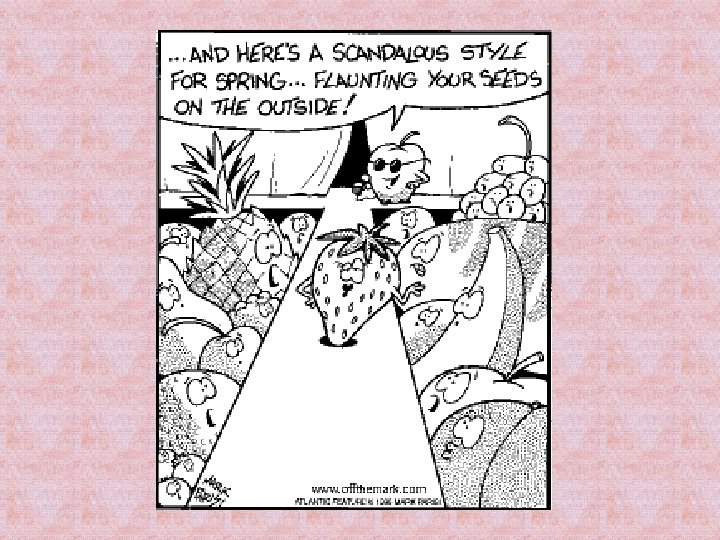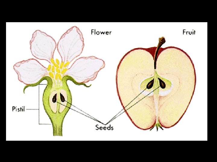 • In most plants the seed develops inside the original ovary of the flower. • The seed is covered by the old ovary which grows and becomes the fruit. • The fruit attracts animals which will eat it and then distribute the seeds in their feces. ZYGOTE EMBRYO OVULE SEED OVARY FRUIT