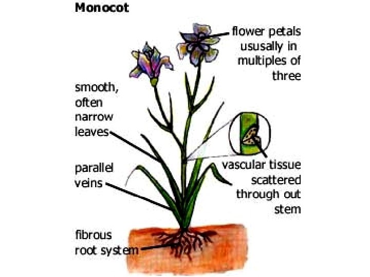 Monocots (ie: grass, grains, onions, lilies, tulips…) • One seed cotelydon • Germinates and puts off 1 leaf • Has a parallel vein pattern • Mostly annuals (grow 1 year and die) • All are Herbaceous (non-woody)