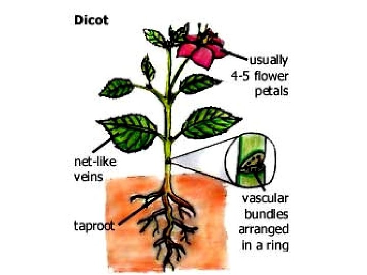 Dicots (ie: rose, apple trees…) • Two seed cotelydons • Germinates and puts off 2 leaves • Has a netted vein pattern • Contains annuals, bi-annuals (2 years), perennials (every year) • Herbaceous & woody forms