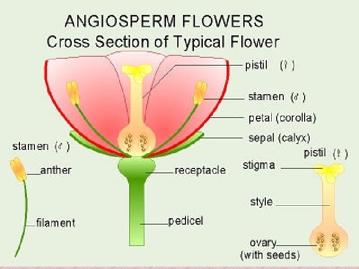 PISTIL (female) is made up of: • Stigma – sticky and ‘catches’ pollen • Style – carries pollen to the ovary • Ovary – contains the eggs. • Ovule – surrounds the eggs STAMEN (male) is made up of: • Anthers – produce pollen • Filament – raises anthers in the air