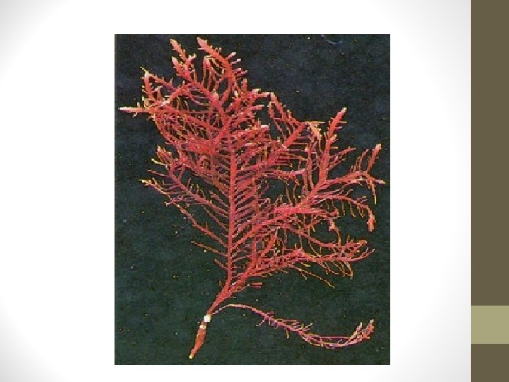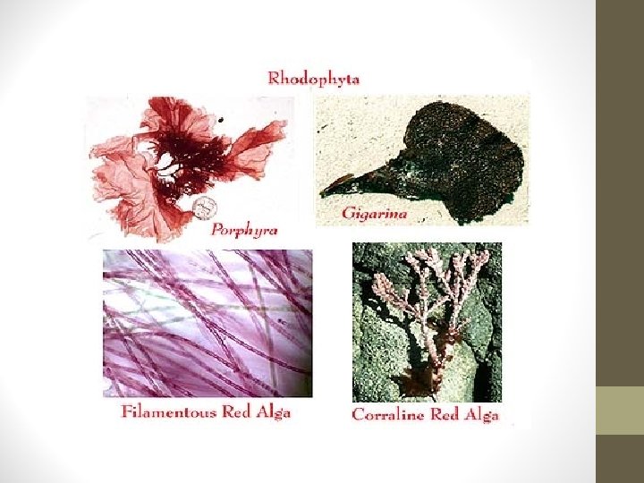 Phylum Rhodophyta Red algae but colors vary Marine seaweeds Smaller than brown algae and live in deeper waters Phycobilins – pigment for absorbing light Some coated with polysaccharide carageenan – cosmetics, gel capsules, cheeses • Agar – extracted from cell walls of red algae • • •