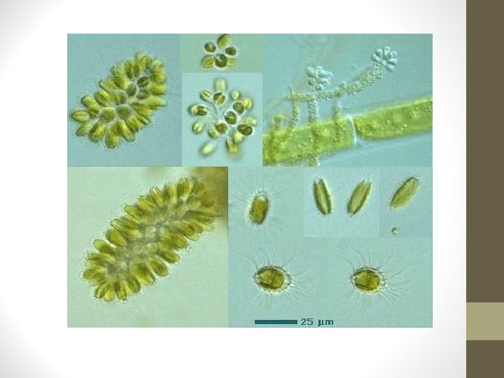 Structure of Algae • • • Thallus or body Unicellular or multicellular Colonial: Volvoz Filamentous: Spirogyra Multicellular: Ulva Asexual and sexual reproduction