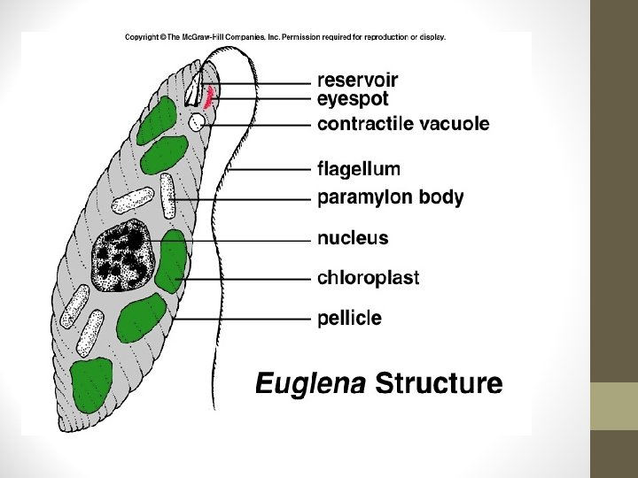 Phylum Euglenophyta • • • Euglenoids Plant-like and animal-like characteristics Many have cholorphyll and are photosynthetic No cell wall, motile Most live in fresh water See picture on page 533