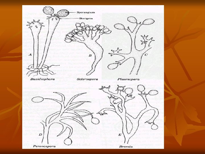n n n Perononsporaceae (Downey mildew disease family ) : - refers to any of several types of oomycete microbes that are obligate parasites of plants. Downy mildews exclusively belong to Peronosporaceae. including species of Basidiophora, Bremia, Peronospora, Phytophthora, Plasmopara, Pseudoperonospora, and Sclerospora. 1 - Plasmopara sp. Sporogiophore branched is irregular with short and striaght sterigma