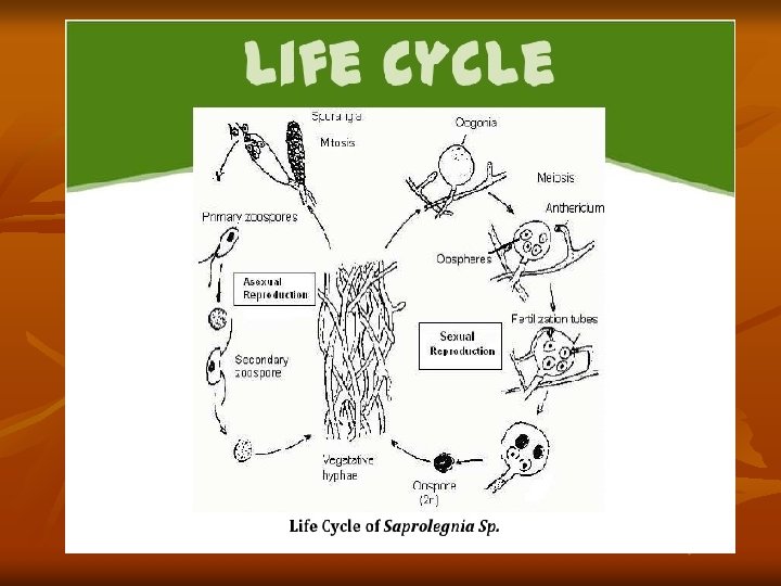 n Saprolegnia is the main genus of water molds responsible for significant fungal infections of freshwater fish and eggs. it likes most water moulds, is both a saprotroph and necrotroph (facultative parasites ). Typically feeding on waste from fish or other dead cells, Saprolegnia has a complex life cycle which includes both sexual and asexual reproduction. Sexual reproduction involves the production of antheridium and oogonium gametangia, which unite for fertilization. The asexual spore of Saprolegnia release motile, primary zoospores. Primary zoospores are active only for a few minutes before they encyst, germinate, and release a secondary zoospore. Secondary zoospores are motile for a longer period of time than primary zoospores then also encysts, before it germinates into a new mycelium,