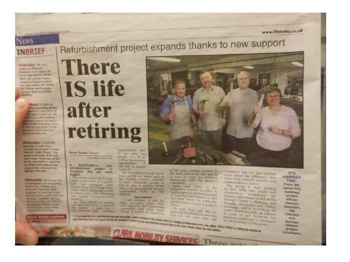 what we are doing COLLECTING TOOLS • Hundreds of donations have been collected REFURBISHING TOOLS • workshops are now running three times a week • volunteers have contributed over 4, 000 hours to The Tool Shed since March 2011 BUILDING PARTNERSHIPS Fife Elderly Forum Link Living Primary & secondary Schools Playgroups & nurseries Allotment holders and growing projects Rotary Club Tools for Self Reliance Local colleges presentations given to 20 community groups Greener Kirkcaldy Project. Scotland Saltire Awards Fife Voluntary Action etc ACT AS MENTORS Interactive mentoring training with Project. Scotland 31 young (under 21 yrs) people have worked in the Tool Shed learning new skills from the experienced volunteers