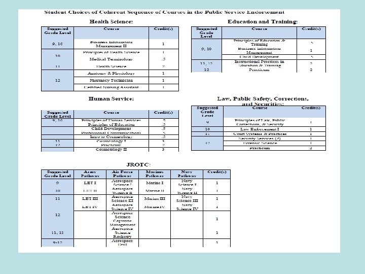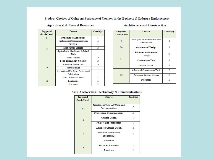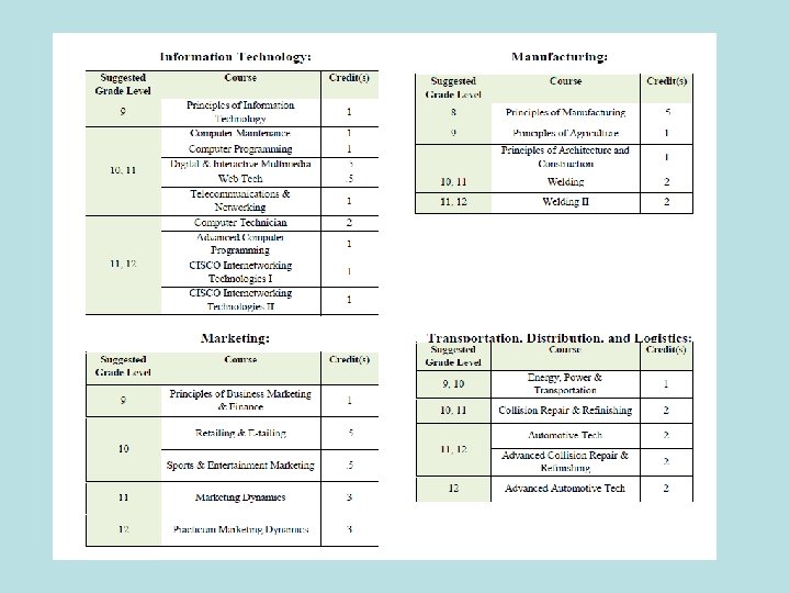 Why are students being pushed to choose a career pathway? u Students with career goals are 16% more likely to graduate from high school. u Students who participate in CTE courses are 30% more likely to complete high school. u Students with well-defined career goals are more likely to persist in college. u Students with well-defined career goals are more likely to attain jobs in their chosen career field after college.