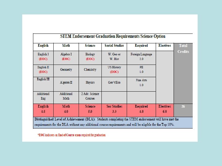 What’s a credit? o High school students earn a half-credit for successful completion of each course each semester. n Semester average must be 70% or better. n Students may earn credit if the year -end average is 70% or better. n Attendance matters! Students who fail to be in class 90% of the time may lose credit for the course. n 26 credits are required for graduation.