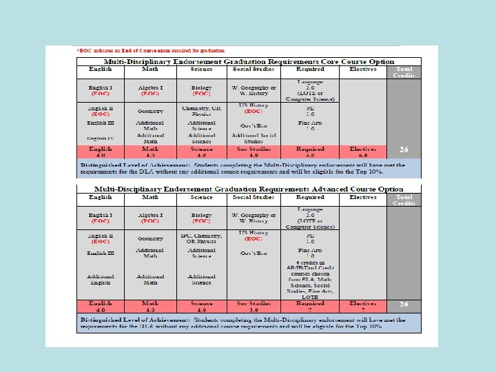 ? How will colleges view the new graduation requirements? u Because the new graduation requirements have recently been developed, no one knows exactly how the new requirements will affect college admissions. u Therefore, it is VERY important for parents and students to check the specific admission requirements for any college a student may be interested in attending.