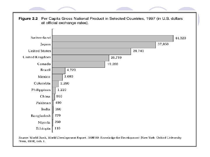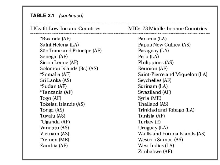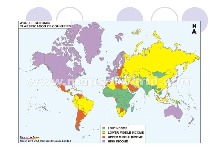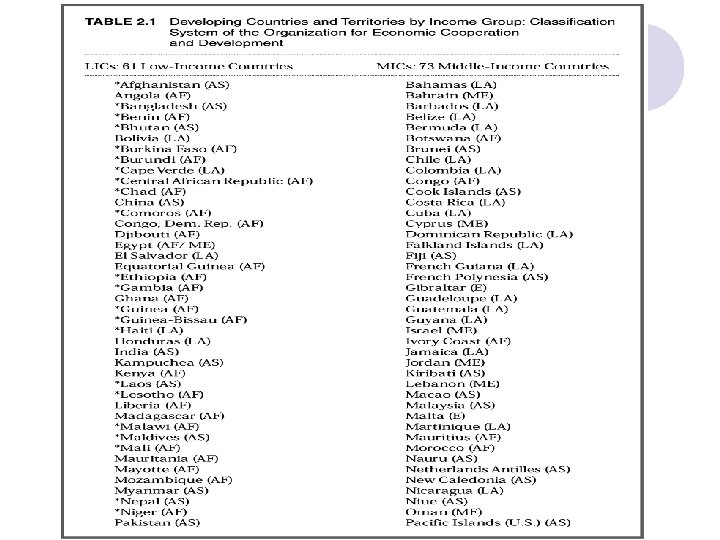 Sự phân chia các nước theo mức thu nhập Hệ thống phân loại của Ngân hàng thế giới (WB): Dựa vào GNI bình quân đầu người (USD/người – WDR 2010) - Các nước có thu nhập cao: > $ 11906 - Các nước có thu nhập TBình: $976 – $11 905 + thu nhập trung bình cao: $3. 856 - $11 905 + thu nhập trung bình thấp: $976 -$3 855 - Các nước có thu nhập thấp: <= $975