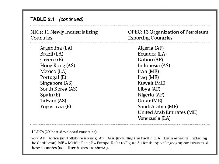 Sự phân chia các nước theo trình độ phát triển kinh tế Các nước phát triển (DCs): Khoảng trên 40 nước với điển hình là các nước G 7 l Các nước công nghiệp hóa mới (NICs): Trước đây: 11 nước điển hình là các nước Đông Á, Hiện nay: 9 nước l Các nước xuất khẩu dầu mỏ (OPEC): 13 nước. l Các nước đang phát triển (LDCs): > 130 nước l