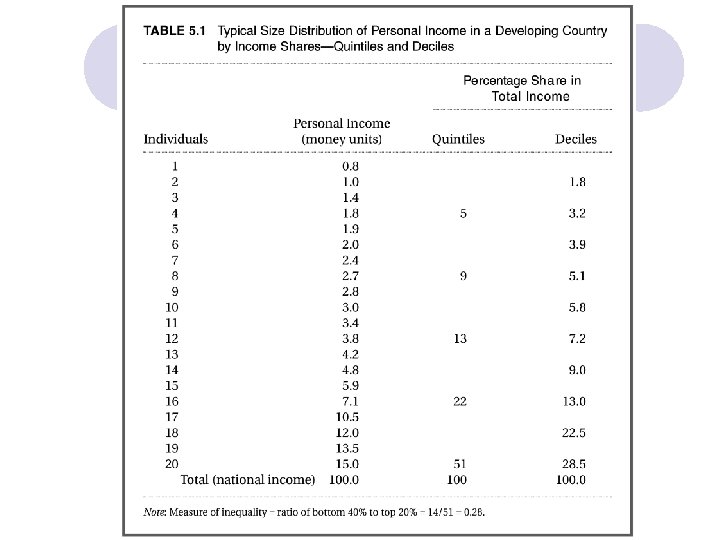 Đánh giá bất bình đẳng về kinh tế (tiếp) l Tiêu chuẩn 40 Tỷ trọng thu nhập của 40% dân số có mức thu nhập thấp nhất đạt - Trên 17%: Tương đối bình đẳng Từ 12 -17%: Bất bình đẳng vừa Dưới 12%: Rất bình đẳng