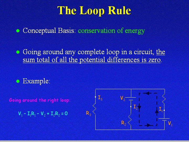 Kirchhoff’s Rules • Kirchhoff’s Junction Rule: – Current going in equals current coming out. • Kirchhoff’s Loop Rule: – Sum of voltage change around a loop is zero.
