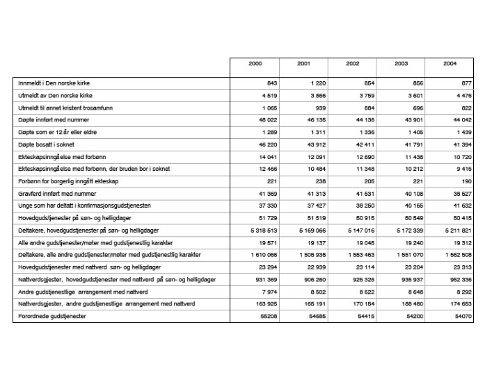 Oppslutningen om kirkelige aktiviteter har vært synkende de siste tiårene. n Døpte i prosent av alle nyfødte falt fra 96, 8% i 1960 til 73, 9% i 2006. n Andelen konfirmerte av alle 14 -åringer falt fra 93% i 1960 til 66, 7% i 2006. n n n Andelen av alle ekteskapsinngåelser som ble gjennomført av Den norske kirke falt fra 85, 2% i 1960 til 44, 2% i 2006. Bare andelen begravelser holdt seg på et høyt nivå, 91, 9% av alle døde i 2006 ble gravlagt i regi av Den norske kirke. Antallet utmeldinger er hvert år høyere enn antallet innmeldinger. I 2005 meldte 1177 personer seg inn og 6036 ut. I en undersøkelse i 2004 svarte 49 prosent av alle spurte at de ikke oppfattet seg selv som kristne ut fra egen oppfatning av hva det er å være kristen, mens 47 prosent oppfattet seg som kristne I en undersøkelse i 2006 svarte 29 prosent at de tror på Gud